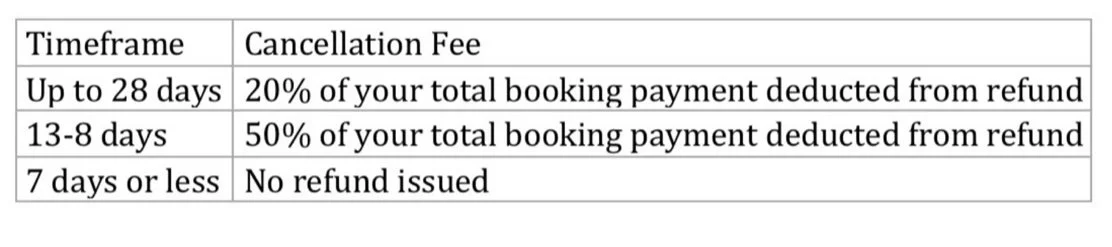 If you wish to cancel or transfer your course/session, please let us know ASAP. See table below for applicable cancellation fees.